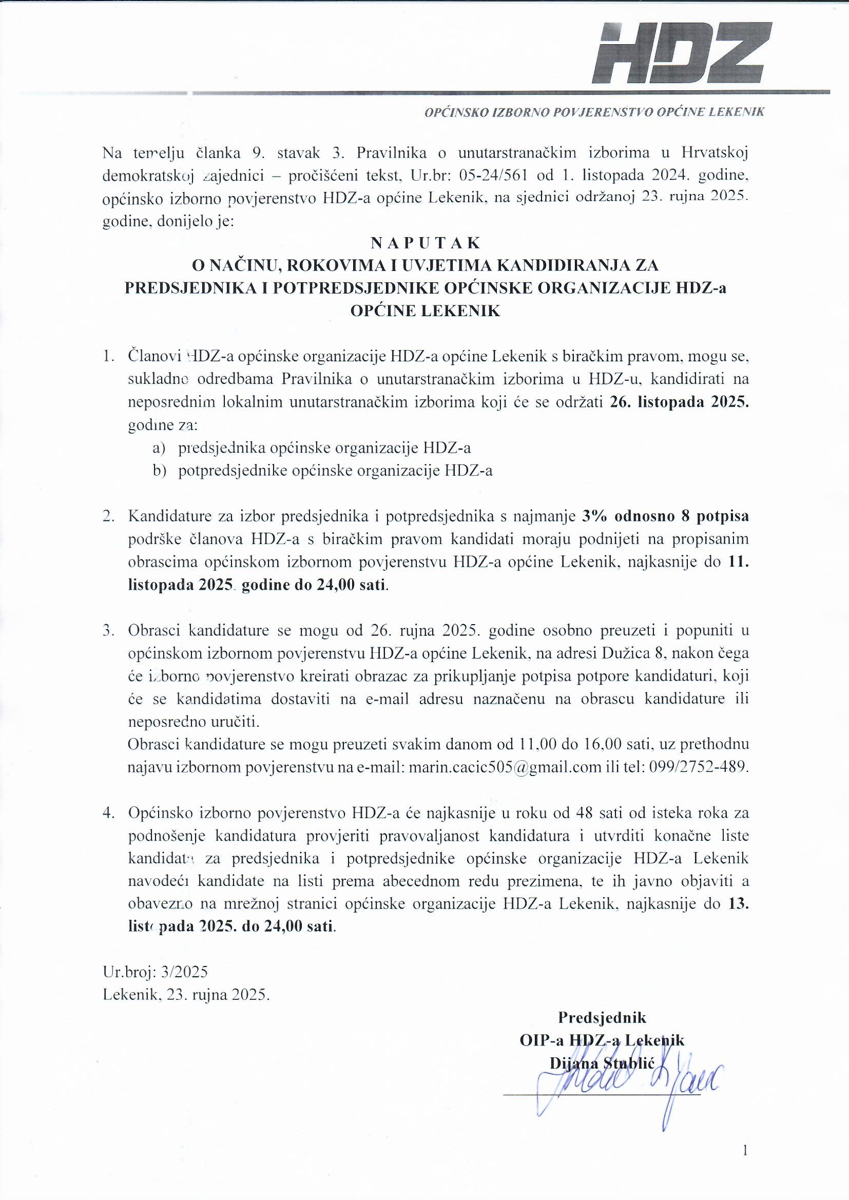 NAPUTAK O NAČINU, ROKOVIMA I UVJETIMA KANDIDIRANJA ZA PREDSJEDNIKA I POTPREDSJEDNIKE OPĆINSKE ORGANIZACIJE HDZ-a OPĆINE LEKENIK