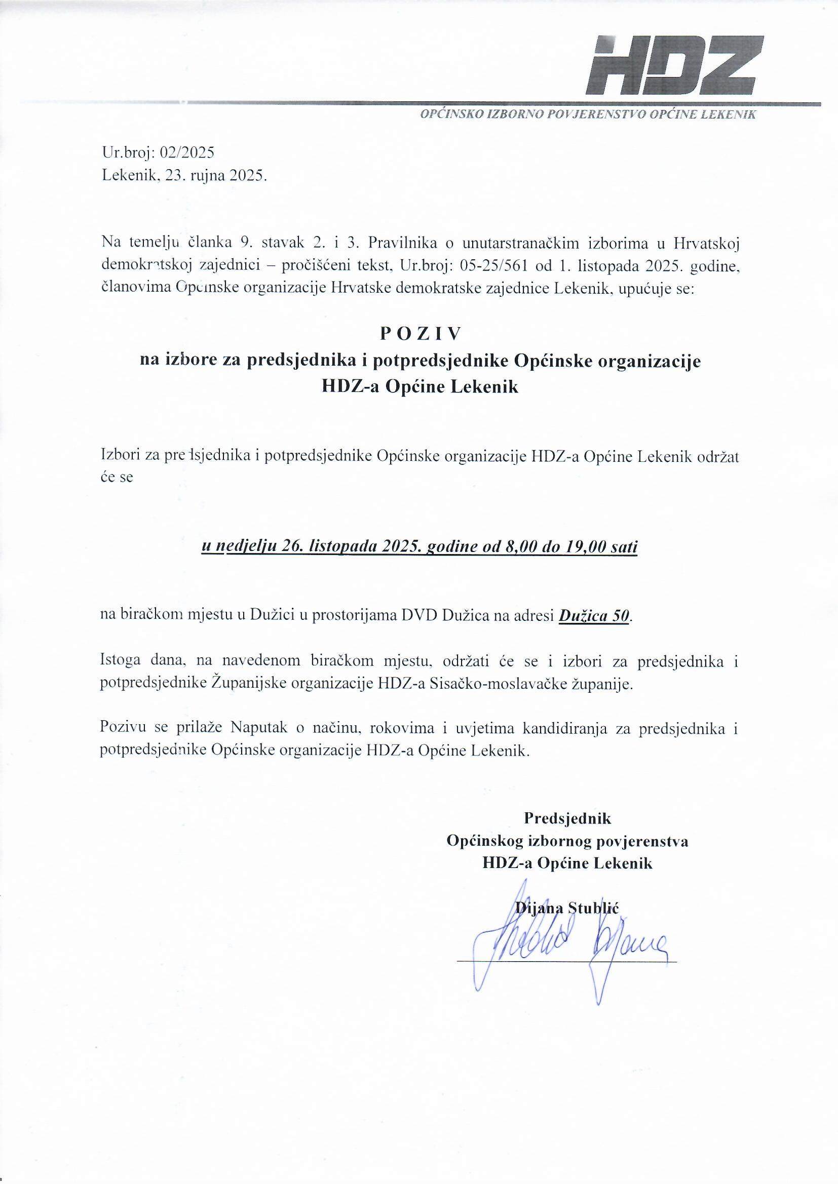 POZIV na izbore predsjednika i potpredsjednike Općinske organizacije HDZ-a Općine Lekenik