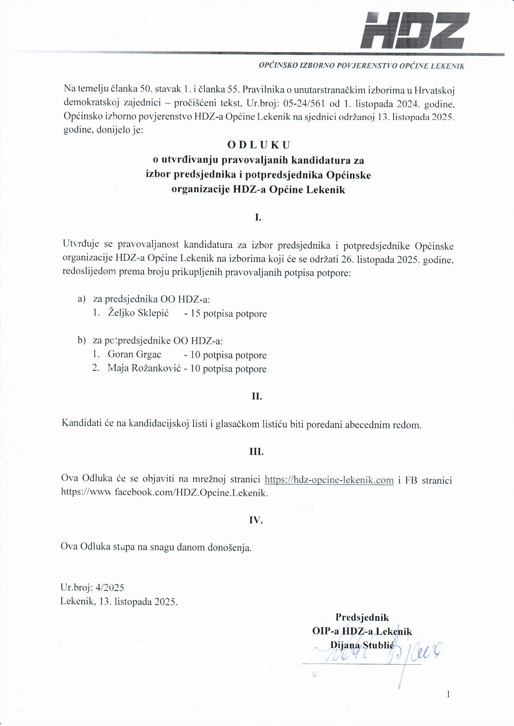 Odluka o utvrđivanju pravovaljanih kandidatura za izbor predsjednika i potpredsjednika Općinske organizacije HDZ-a Općine Lekenik
