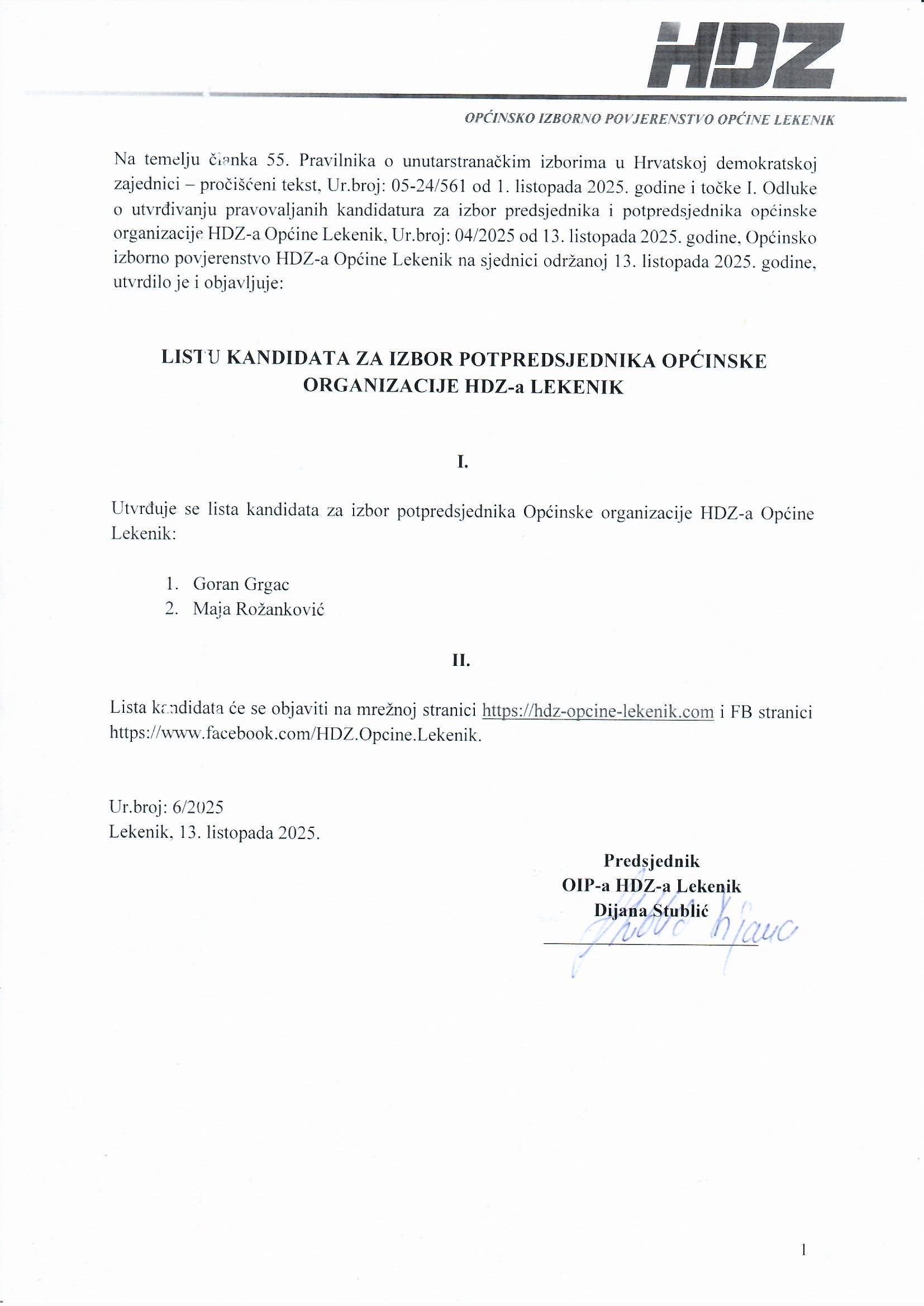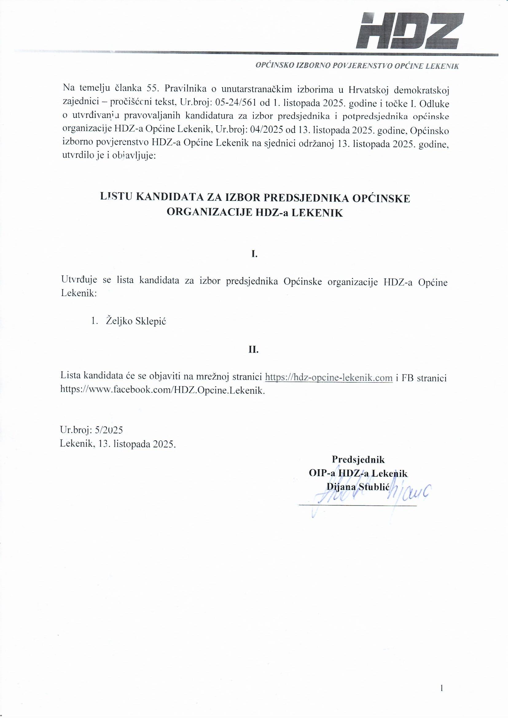 Lista kandidata za izbor predsjednika Općinske organizacije HDZ-a Općine Lekenik